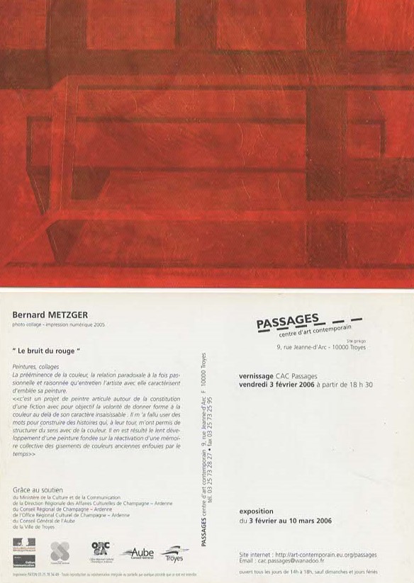The artist has a fascination with color. In this exhibition, he seeks to give form to color, using red taken from the Pompeian red of the fresco in the Villa of the Mysteries, painted around 70-60 BC. The artist aims to bring together megalography and the vulgarity of luparna graffiti in his works. Bernard Metzger incorporates representations of erotic bodies using the principle of silver halide photography overprinting.