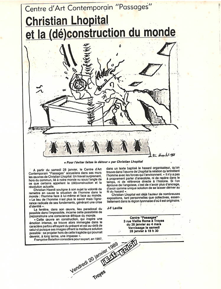 À partir du samedi 28 janvier, le centre d’art contemporain passages accueillera dans ses murs les œuvres de Christian Lhopital. Un travail surprenant, hors du commun, lié à notre monde vu sous l’angle de ce que certains appellent la (dé)construction et la révolution actuelle.