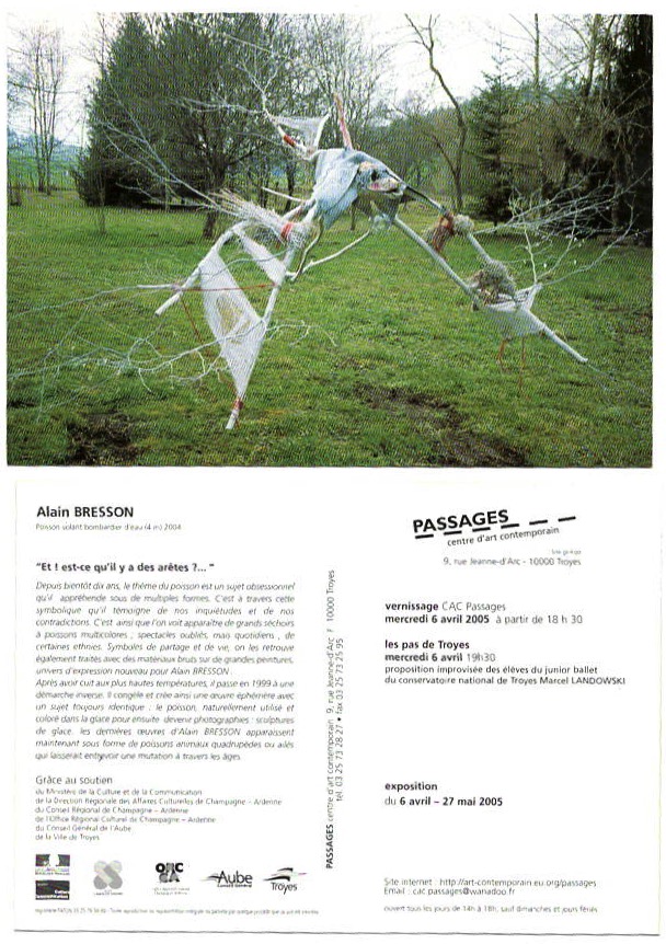 Alain Bresson, artiste et sculpteur né en 1948 à Casablanca, vit et travaille dans le Jura. Le poisson, son sujet de prédilection, est un motif récurant dans ses œuvres. Pour lui, le poisson, animal marin, est un symbole de vie, de fécondité, de générosité et de partage qu’il décline à travers divers matériaux bruts ou transformés. Ses sculptures allient terre cuite, caoutchouc, béton, écorces, branches et mousse ramassée.